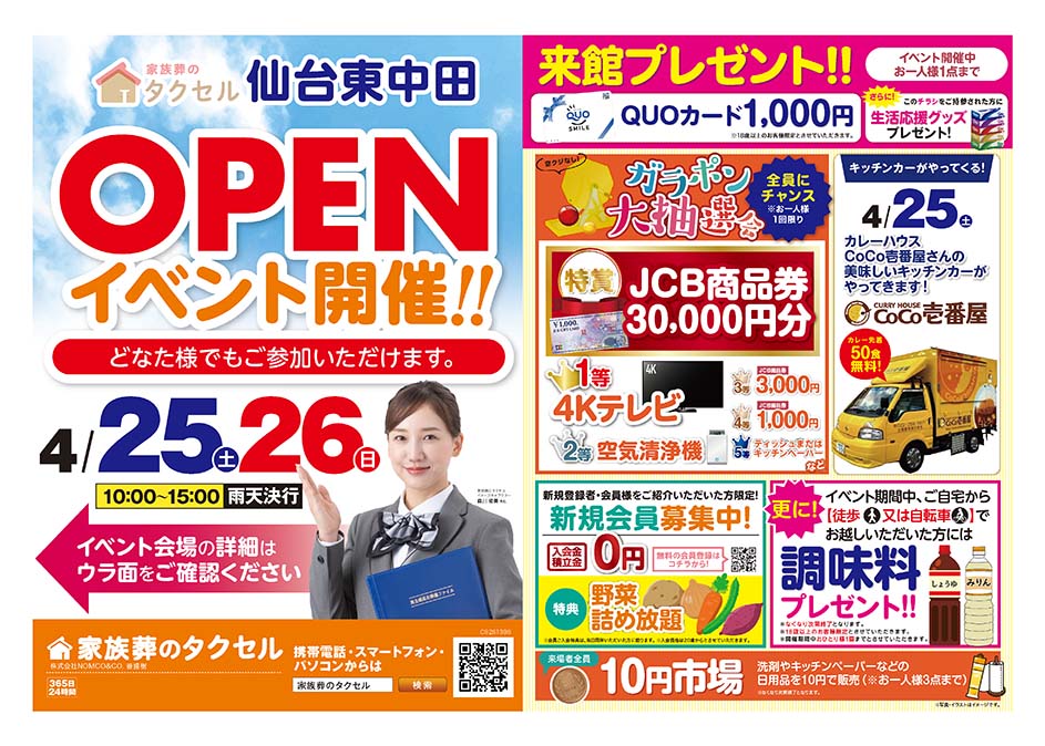 <宮城県>【4月25日~26日 家族葬のタクセル仙台東中田 OPENイベント開催!!】お葬式や相続のわからないこと、じっくり聞けるイベント☆参加無料☆